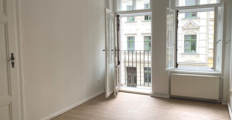 Ein kleiner französischer Balkon bringt gemütliches Flair in das helle Wohnzimmer.