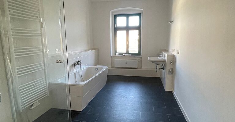 Die ca. 80m² große 2 Raumwohnung befindet sich im 3. Obergeschoss eines gepflegten Mehrfamilienhauses und sucht neue Mieter. Das große Tageslichtbad verfügt über eine Dusche sowie eine Wanne.